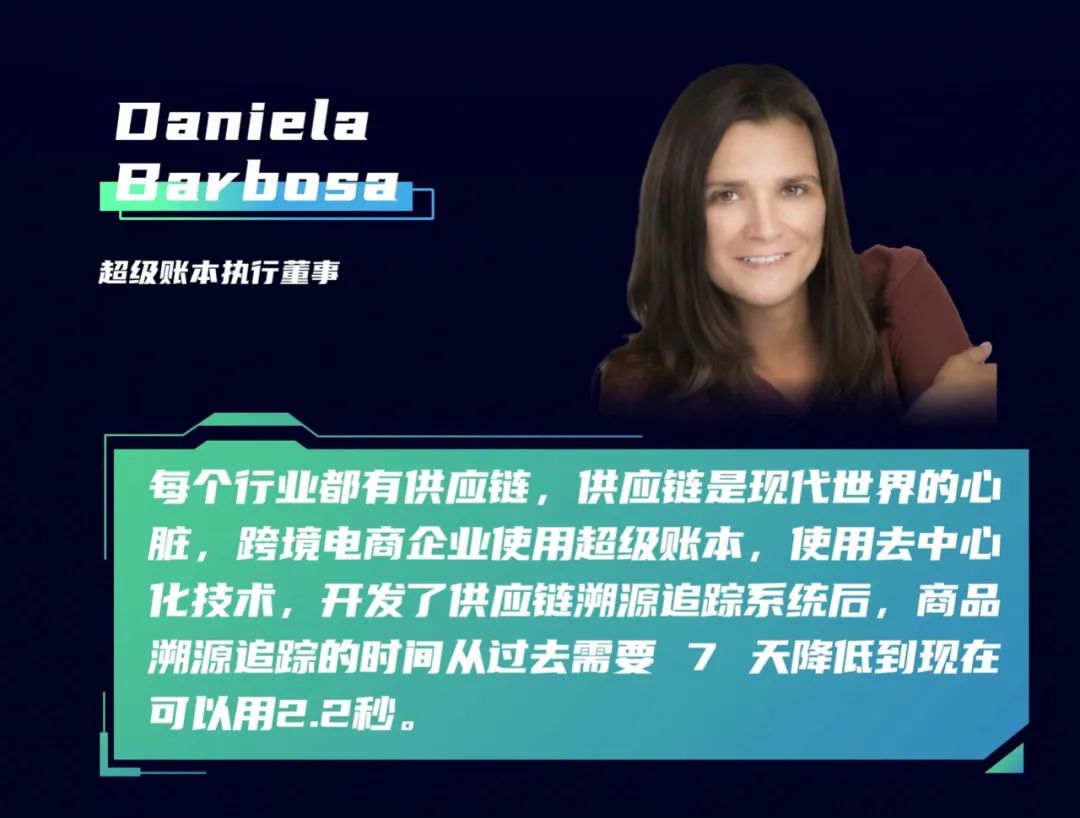 超級(jí)賬本執(zhí)行董事Daniela Barbosa則在現(xiàn)場(chǎng)帶來(lái)了更多關(guān)于“超級(jí)賬本”的論點(diǎn),她表示超級(jí)賬本不但持續(xù)推進(jìn)區(qū)塊鏈技術(shù),也持續(xù)關(guān)注行業(yè)應(yīng)用,這次發(fā)布制造業(yè)特別興趣小組,是在原來(lái)的垂直行業(yè)的特別興趣小組比如金融貿(mào)易、資本市場(chǎng)、氣候、電信、供應(yīng)鏈等領(lǐng)域外的一次突破,也意味著制造業(yè)使用區(qū)塊鏈正走向成熟。由信通院和樹(shù)根格致選出來(lái)了兩位組長(zhǎng),也表示他們?cè)谥圃鞓I(yè)中使用區(qū)塊鏈的領(lǐng)導(dǎo)地位。未來(lái)期待和更多中國(guó)優(yōu)秀代表達(dá)成合作,共同推進(jìn)中國(guó)工業(yè)區(qū)塊鏈的進(jìn)展。