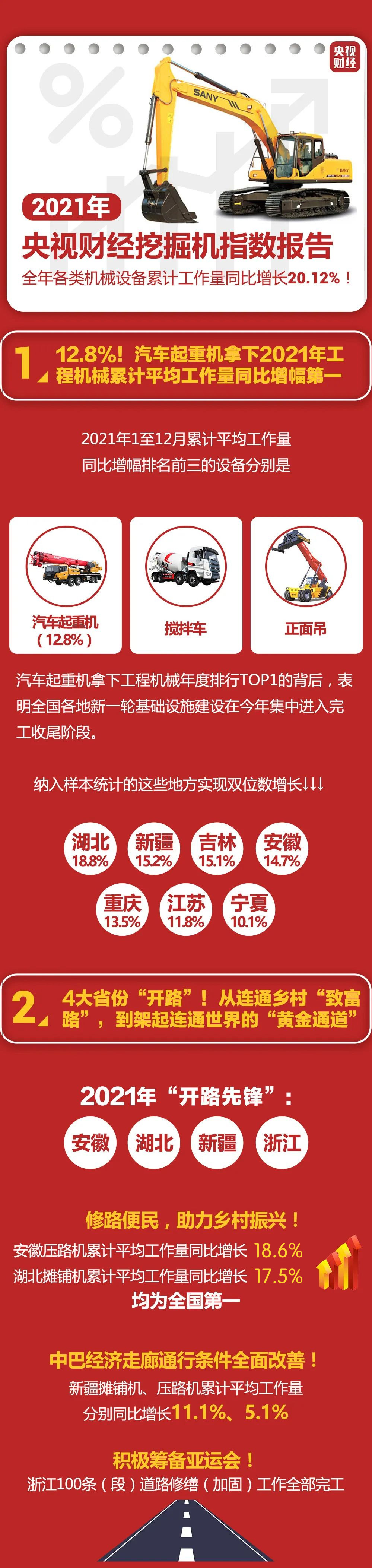 2021年我國持續(xù)加大基礎(chǔ)設(shè)施建設(shè)力度,為社會經(jīng)濟發(fā)展注入強勁動力。央視財經(jīng)挖掘機指數(shù)顯示,2021年我國各類工程機械設(shè)備累計工作量同比增長20.12%