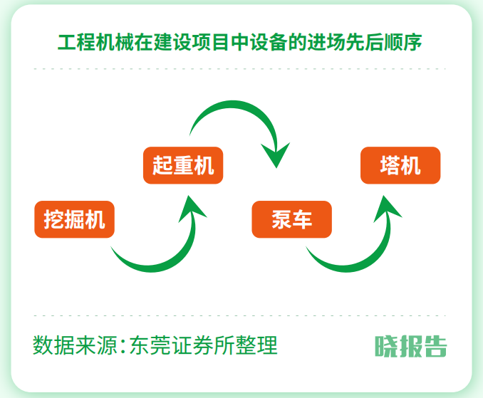 蓋一棟樓,要先挖坑打地基、再打柱梁,一層層往上蓋。對應到主要三大設備,出場順序大致是:挖掘機攪拌車塔機。