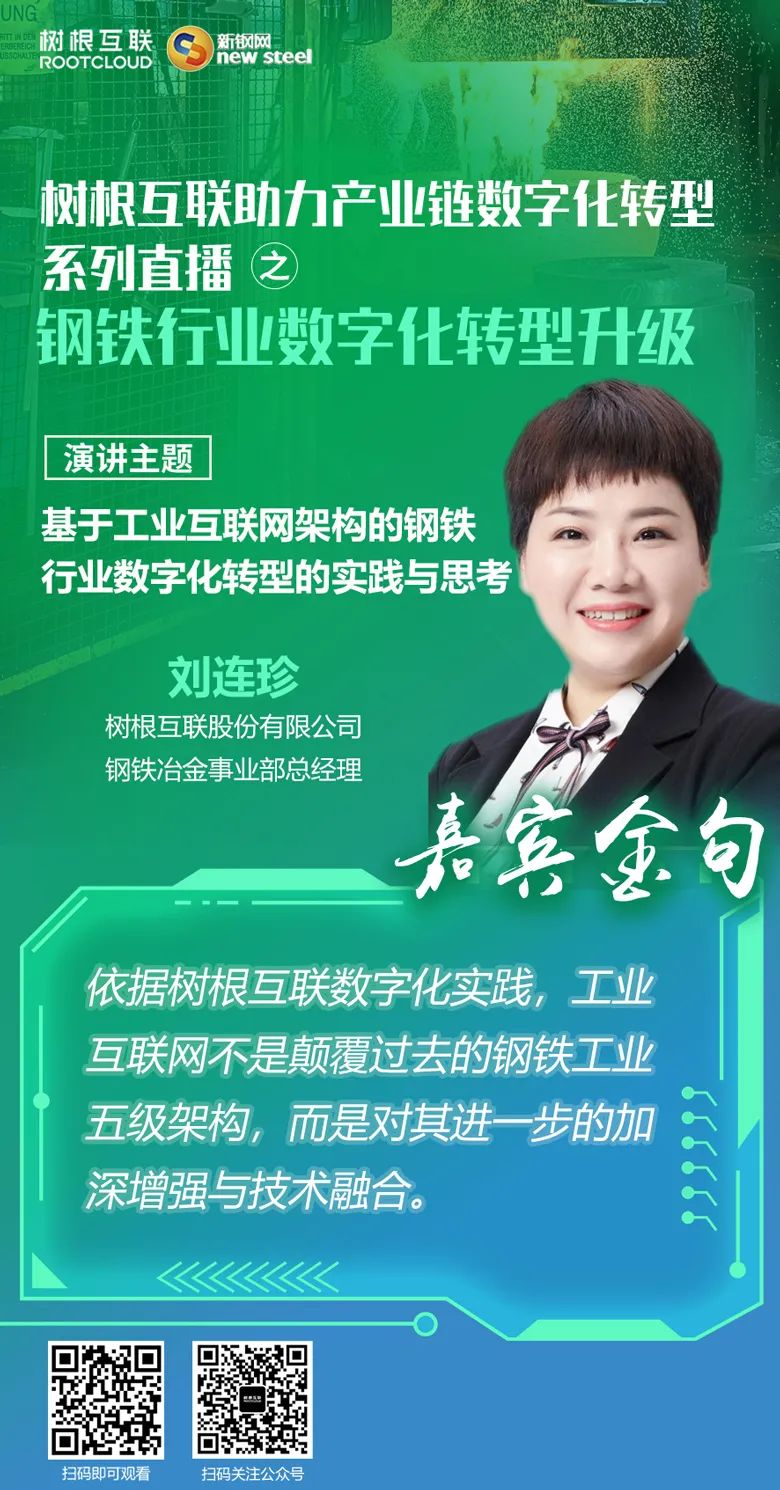 對于鋼鐵行業(yè)當(dāng)下的現(xiàn)狀,樹根科技鋼鐵冶金事業(yè)部總經(jīng)理劉連珍指出:“鋼鐵行業(yè)面臨碳中和、限產(chǎn)等挑戰(zhàn),且同樣存在以數(shù)字化技術(shù)帶來的行業(yè)轉(zhuǎn)型升級機(jī)遇,要以降本、提質(zhì)、增效為核心價值點(diǎn),逐步促進(jìn)鋼鐵企業(yè)數(shù)字化轉(zhuǎn)型。”樹根科技致力于深耕鋼鐵行業(yè),提供從咨詢規(guī)劃到落地的整體解決方案,為鋼鐵企業(yè)打造價值驅(qū)動“新一代數(shù)字化平臺”。她進(jìn)一步介紹:“樹根科技打造的根云平臺不僅是安全可控的工業(yè)互聯(lián)網(wǎng)平臺基座,能端到端打通工控安全和網(wǎng)絡(luò)安全。依托根云平臺我們根據(jù)流程驅(qū)動與數(shù)據(jù)驅(qū)動“雙輪”驅(qū)動,打造行業(yè)先進(jìn)的業(yè)務(wù)協(xié)作平臺,按客戶需求打造業(yè)務(wù)應(yīng)用,以鋼鐵行業(yè)業(yè)務(wù)場景開展創(chuàng)新應(yīng)用,協(xié)同提高鋼鐵企業(yè)核心競爭力。”  談到樹根科技對鋼鐵行業(yè)數(shù)字化轉(zhuǎn)型的實(shí)踐,劉連珍以具體行業(yè)場景為切入點(diǎn)分享了具體的案例:“樹根科技基于根云平臺和數(shù)據(jù)中臺,打通數(shù)據(jù)孤島,幫助鋼鐵企業(yè)實(shí)現(xiàn)數(shù)字孿生應(yīng)用、全流程透明工廠整體分析圖譜、三現(xiàn)數(shù)據(jù)透明化管理。基于點(diǎn)狀價值挖掘,例如轉(zhuǎn)爐冶煉節(jié)奏及成本優(yōu)化、鍋爐燃燒優(yōu)化控制等,點(diǎn)-線-面相結(jié)合有序推進(jìn)鋼鐵企業(yè)精益化、數(shù)字化融合管理,提供銷量預(yù)測、智能銷售調(diào)價、能源優(yōu)化調(diào)度、設(shè)備智慧運(yùn)維、全過程質(zhì)量管控、安環(huán)一體化等解決方案。另外,對鋼鐵企業(yè)設(shè)備預(yù)測性運(yùn)維以及全流程質(zhì)量分析與工藝優(yōu)化兩個行業(yè)場景,根云平臺也能發(fā)揮核心能力,快速建立BOM級別數(shù)字孿生建模,并基于制造大數(shù)據(jù)和AI智能算法分析,提供符合鋼鐵行業(yè)業(yè)務(wù)場景的解決方案。” 本次三位專家對鋼鐵行業(yè)數(shù)字化轉(zhuǎn)型升級的分享內(nèi)容收獲了大量好評與反饋,樹根科技擁有豐富的鋼鐵行業(yè)經(jīng)驗(yàn)與冶金行業(yè)領(lǐng)先的技術(shù)能力,能為企業(yè)提供端到端的整體服務(wù)能力,以降本、提質(zhì)、增效為核心價值點(diǎn),持續(xù)深耕鋼鐵行業(yè),愿成為鋼鐵企業(yè)的最佳合作伙伴,攜手推進(jìn)鋼鐵行業(yè)的數(shù)字化轉(zhuǎn)型升級。
