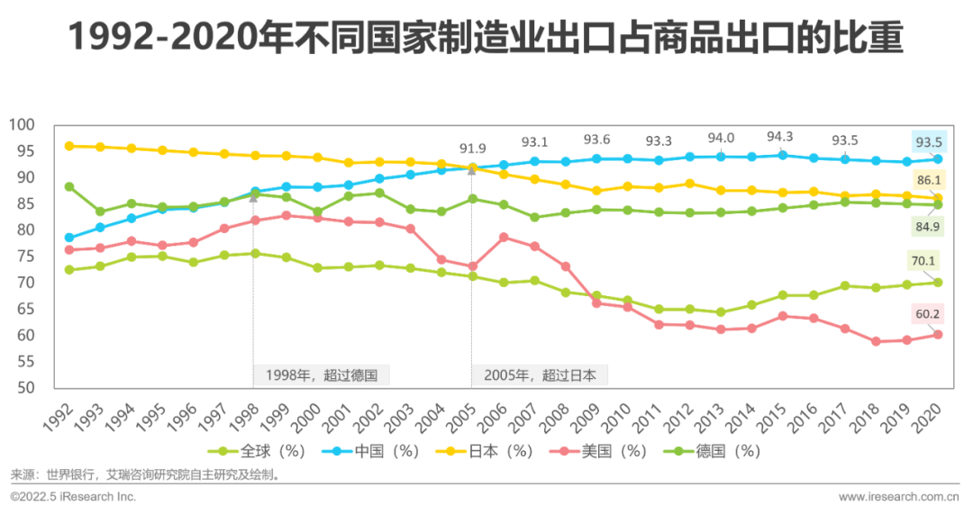 從世界銀行公布的制造業(yè)出口數(shù)據(jù)來看,中國制造業(yè)出口占商品出口的比重(以下簡稱制造業(yè)出口)從1992年開始,就已經(jīng)超過全球、美國,并于1998年超過德國、2005年與日本持平。從2006年開始,中國制造業(yè)出口一直維持第一的位置,是當之無愧的制造業(yè)生產(chǎn)及出口大國。2020年,中國、日本、德國制造業(yè)出口分別為93.5%、86.1%、84.9%,中國的制造業(yè)出口優(yōu)勢依然比較明顯。