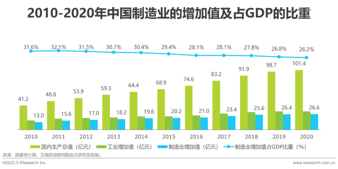 近10年,中國規(guī)模以上制造業(yè)增加值的平均值為21萬億,占國內(nèi)生產(chǎn)總值的比重的平均值為28.8%,對GDP的貢獻十分顯著