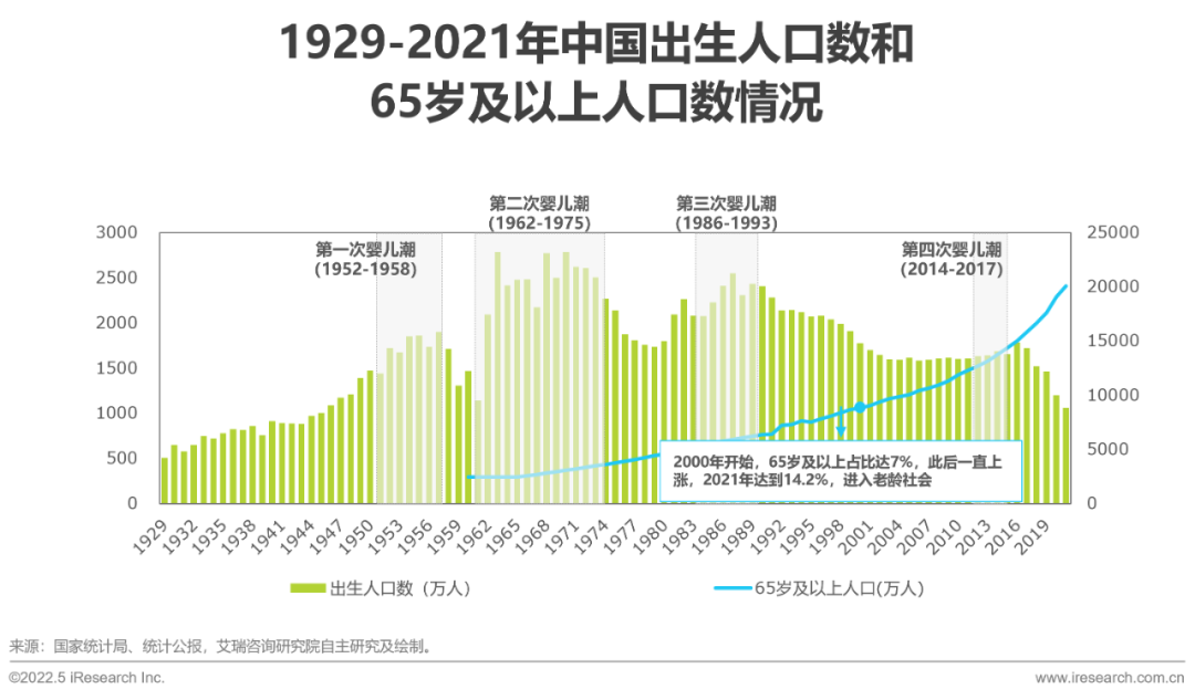 針對老齡人口:從2000年開始,中國65歲及以上的人口占比達7%,此后便一直上漲,在2021年達到14.2%,中國進入老年社會。