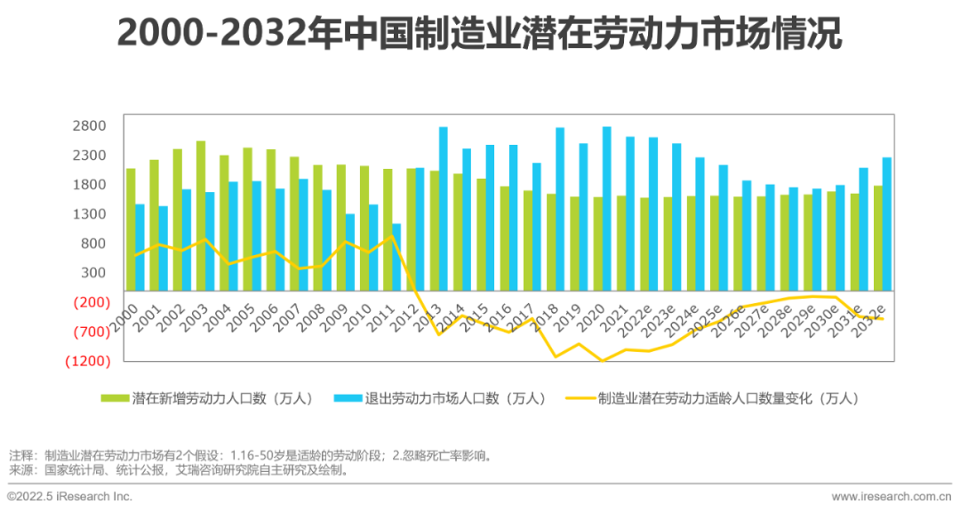 針對制造潛在勞動力市場:從2012年開始,中國制造業(yè)的潛在勞動力適齡人口數(shù)量變化(即潛在新增勞動力人口數(shù)與退出勞動力市場人口數(shù)之差)為負數(shù),持續(xù)到2021年底,制造業(yè)潛在勞動力市場平均每年減少700萬左右的適齡人口,并且制造業(yè)潛在勞動力市場的適齡人口將持續(xù)減少的現(xiàn)象或?qū)⒕S持10年以上,帶來的影響可能就是行業(yè)潛在勞動力不足或者制造業(yè)企業(yè)需要提供更具吸引力的工作環(huán)境、工作福利等來吸引年輕群體。