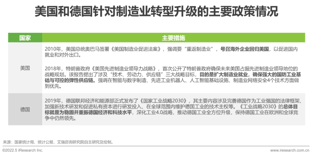 發(fā)達國家紛紛出臺政策引導(dǎo)制造業(yè)回流并轉(zhuǎn)型升級,如美國和德國。美國奧巴馬政府和特朗普政府都出臺相關(guān)政策表示要“重返制造業(yè)”,同時,還強調(diào)要在技術(shù)、供應(yīng)鏈等方面發(fā)力,確保美國占據(jù)先進制造業(yè)的領(lǐng)導(dǎo)地位。德國則在2019年就提出《國家工業(yè)戰(zhàn)略2030》,并在次年將工業(yè)4.0升級為全國戰(zhàn)略,旨在保證就業(yè)的同時,要在全球范圍內(nèi)維護德國工業(yè)的技術(shù)主權(quán)、保持德國工業(yè)在歐洲和全球競爭中的領(lǐng)先地位、轉(zhuǎn)型升級為智能制造。