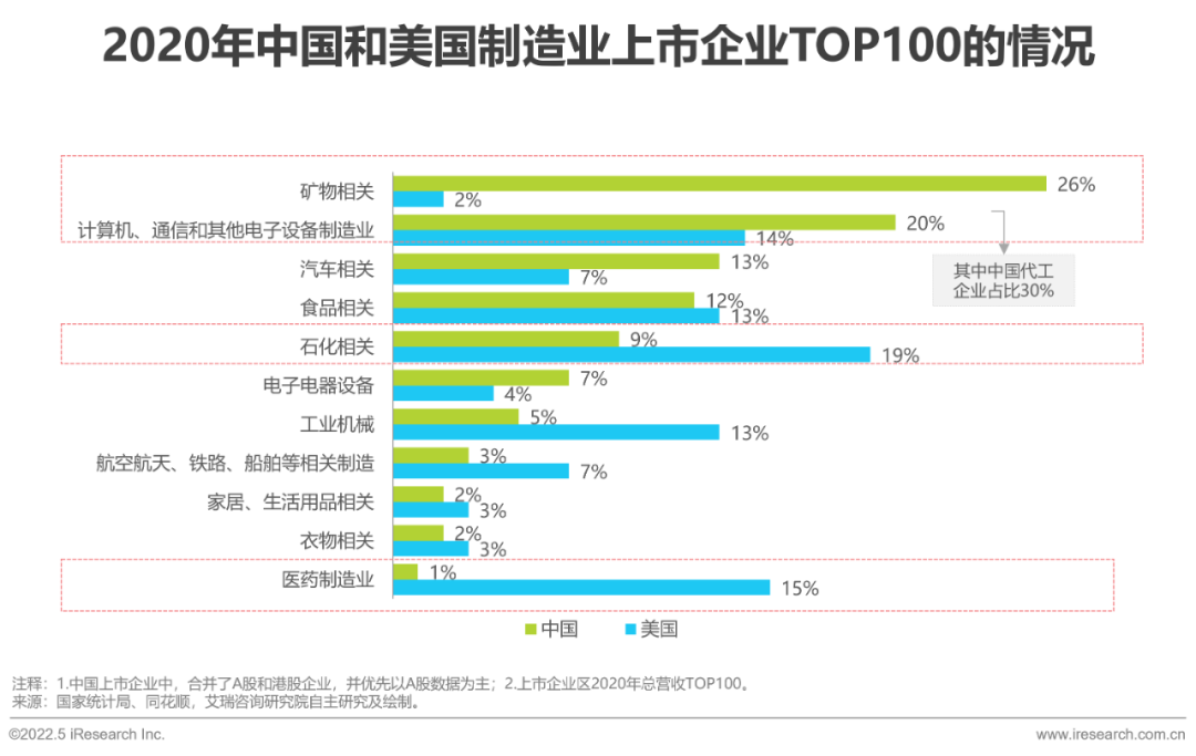 對比2020年中國和美國營收TOP100的制造業(yè)上市企業(yè)數(shù)據(jù),中國的制造業(yè)企業(yè)更為集中,“礦物相關(guān)(26%)”、“計算機、通信和電子設(shè)備制造業(yè)(20%)”、“汽車相關(guān)(13%)”是TOP3大類,占比之和達59%。值得注意的是,“計算機、通信和電子設(shè)備制造業(yè)”中,以代工為主的企業(yè)占比30%,這也側(cè)面說明中國的制造業(yè)缺少核心技術(shù)。反觀美國, “石化相關(guān)”、“醫(yī)藥制造業(yè)”、“計算機、通信和電子設(shè)備制造業(yè)”是TOP3大類,占比之和為48%,其產(chǎn)業(yè)結(jié)構(gòu)更為分散。