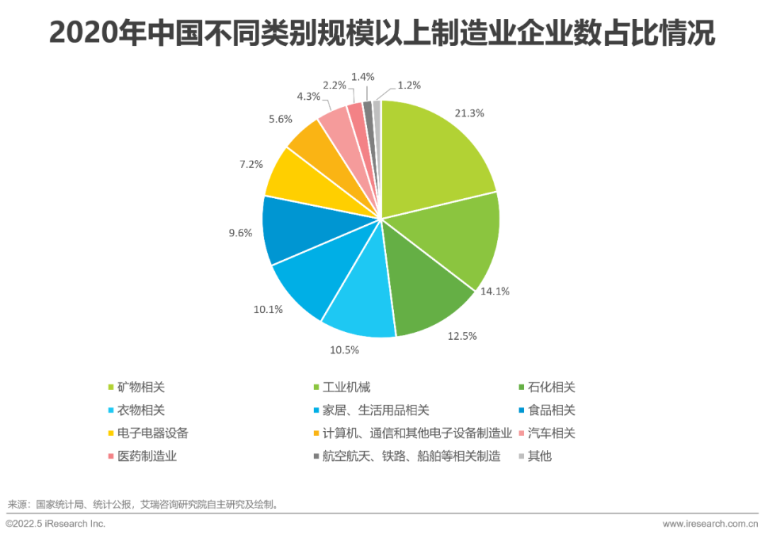 根據(jù)國家統(tǒng)計局發(fā)布的數(shù)據(jù),礦物相關(guān)、工業(yè)機械、石化相關(guān)是2020年不同類別規(guī)模以上制造業(yè)企業(yè)數(shù)的TOP3,其占比總和達48%,其中礦物相關(guān)占比最高,占比為21.3%,中國的制造業(yè)整體偏向資源導(dǎo)向型。