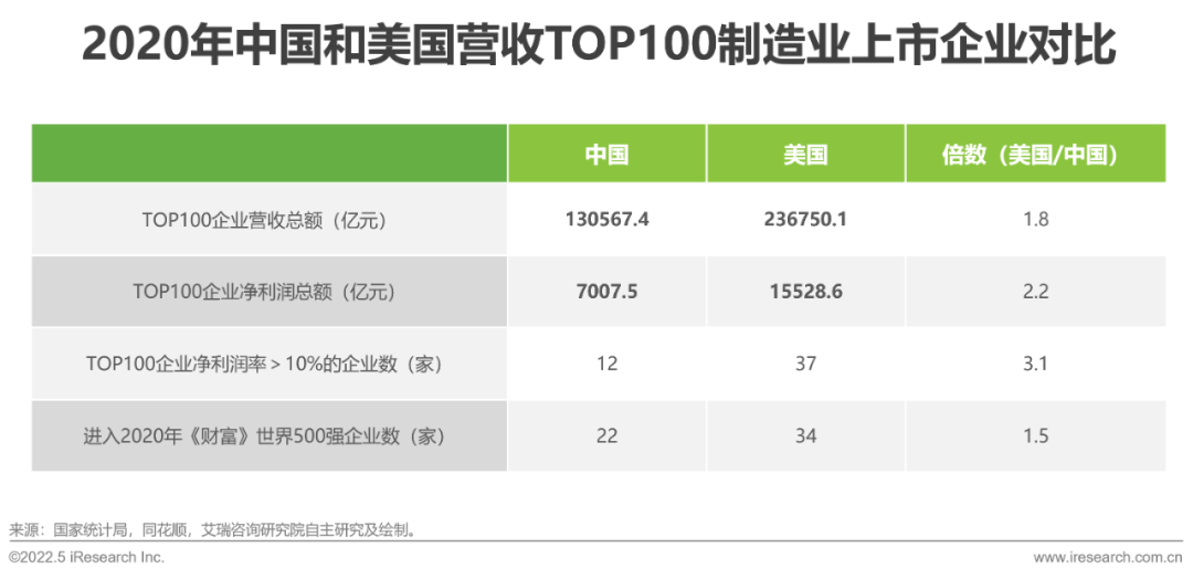 對比2020年中國和美國營收TOP100制造業(yè)上市企業(yè)數(shù)據(jù),美國制造業(yè)企業(yè)凈利率超過10%的企業(yè)有37家,是中國的3.1倍。整體來看,美國制造業(yè)企業(yè)在營收總額、凈利潤等方面更具優(yōu)勢。通過將2020年中國和美國營收TOP100制造業(yè)上市企業(yè)與2020年《財富》發(fā)布的世界500強名單對比發(fā)現(xiàn),美國有34家世界500強制造業(yè)上市企業(yè),而中國只有22家,美國的制造業(yè)企業(yè)知名品牌更多。