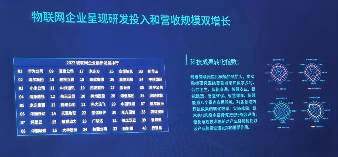 在連續多年三新成果評選的基礎上,今年物博會還創新推出了首個物聯網產業創新指數成果,量化展現物聯網在推動數字經濟發展、賦能傳統產業轉型升級方面的重要作用。據現場發布的2022物聯網創新發展排行榜,樹根科技、華為公司等入選TOP10,呈現研發投入和營收規模雙增長。
