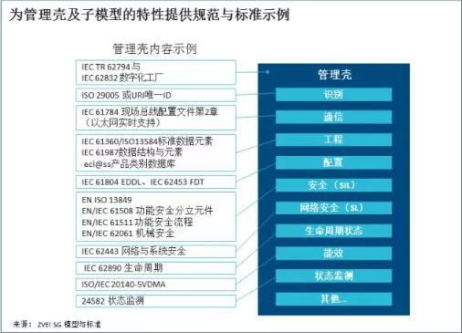 管理殼中的諸項內容都盡量做到遵從標準,為未來的系統擴展和萬物互聯打好基礎。圖3簡介了管理殼及子模塊的特性需要符合的標準與規范。