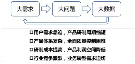 制造型企業(yè)面臨著客戶需求個性化,產品上市時間短,研制成本提高等巨大挑戰(zhàn)。這種挑戰(zhàn)本身更多體現在企業(yè)與企業(yè)之間如何以更低的成本、更高的質量、更快的速度滿足客戶多樣的需求。所以傳統方式很難解決大數據時代的企業(yè)問題,需要有創(chuàng)新的手段來解決。目前越來越多的企業(yè)通過大數據來驅動業(yè)務創(chuàng)新,提升產品質量、降低研制成本、加快上市周期。