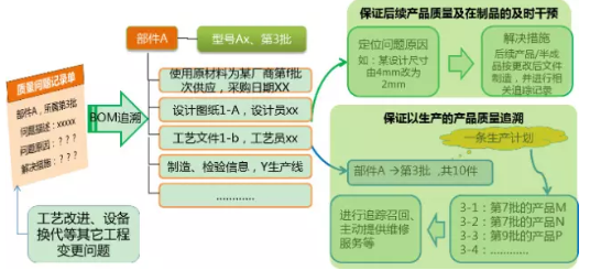 目標:可通過BOM集成管理的數據,進行產品問題的向上及向下追溯,一方面追蹤問題根源并對其影響范圍進行確定(如存在多少在制品等)并干預,保證后續(xù)產品的質量;另一方面根據問題根源,改進原材料或設計工藝等,從根源上解決問題,降低問題重復帶來的損失。