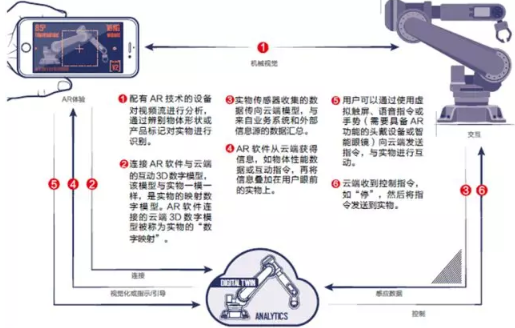 《哈佛商業評論》中文最新一期刊登了管理大師邁克爾波特和PTC的CEO Heppelmann聯合發布的文章《管理者的AR指南》。普通用戶可以下載這篇文章,只需要借助簡單的手機APP,就可以看到紙面上跳出來真實運轉的機器人,和機器人的數字孿生模型在不斷地跳閃著工作狀態。