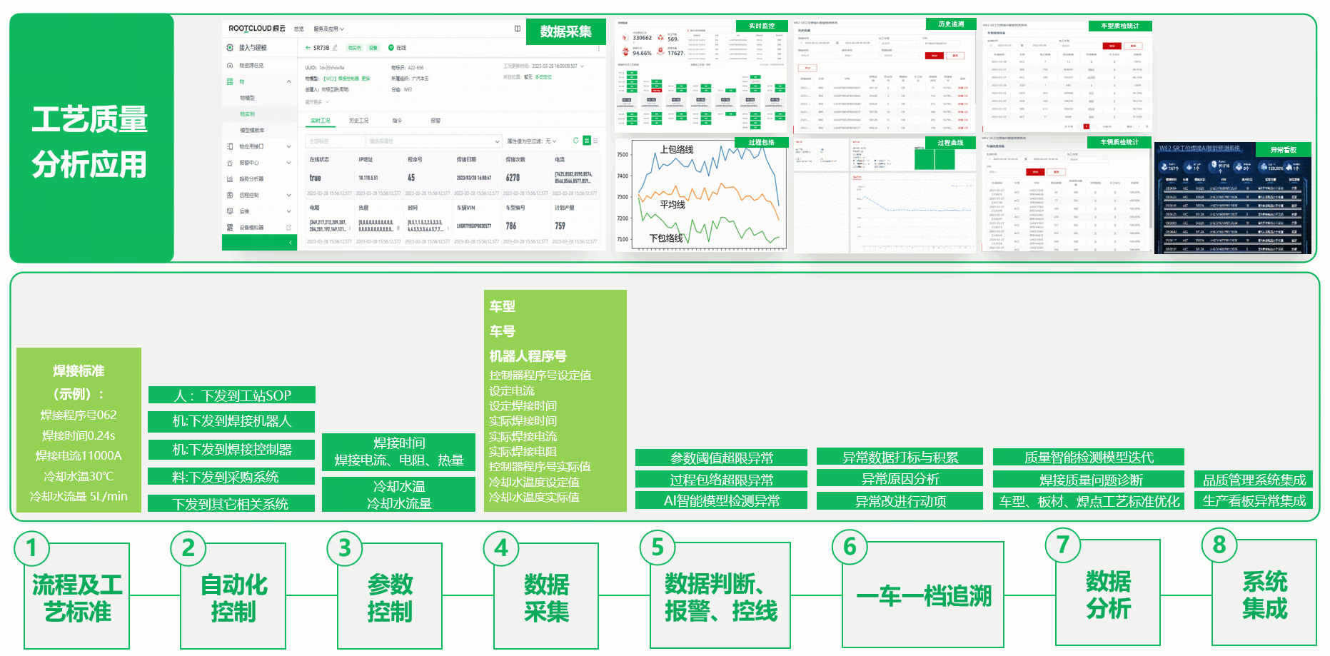 通過采集現場實時焊接過程數據以及車輛屬性數據,實現數據集中存儲,并結合焊接質量檢測模型,實現焊接正常/異常情況自動判斷。實現對全數焊點100%檢查,并建立每臺車輛的可追溯焊接質量檔案。